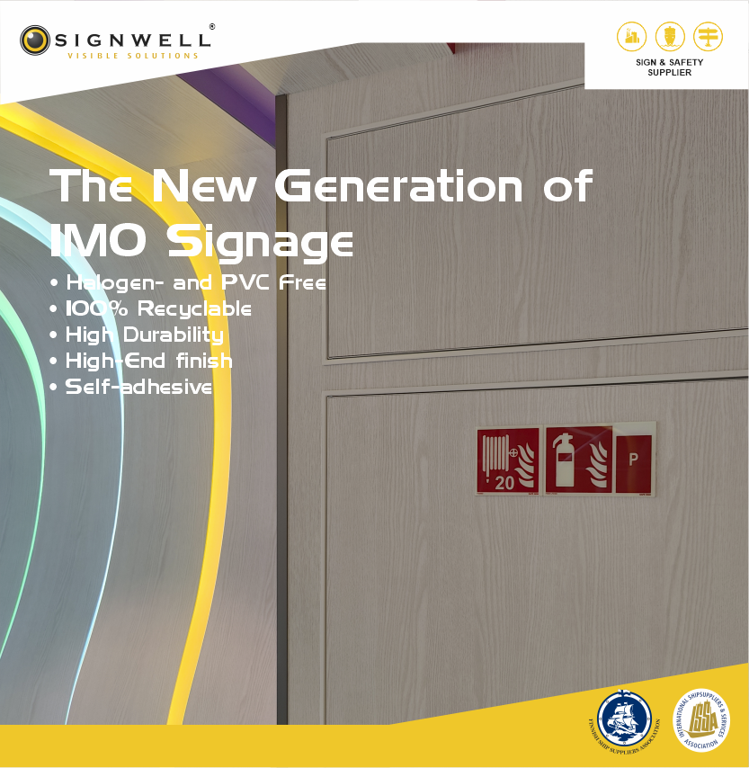 Signwell:illa on laajin valikoima IMO kilpiä. Avaimet käteen palveliuillamme hoidamme asiat alusta loppuun. Kartoitamme palo- ja poistumisteiden opaste- ja turvallisuuskilpi tarpeet. Suoruitamme täydellisen Low Location Light LLL-järjestelmän tarkastuksia ja mittauksia maailmanlaajuisesti tiimimme kanssa. Kattava korkealaatuinen sertifioitu SOLAS -turvallisuustuote valikoima, kuten, pelastusliivejä, E.E.B.D.- naamioita luotsitikkaita, Spray Stop Anti-Splash teippejä yms. FIRE ISOLATOR konsepti.